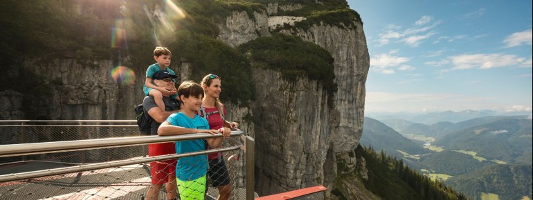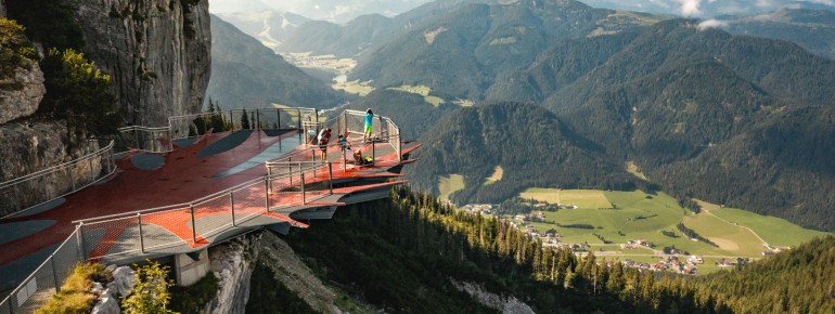 At about 700 metres above the abyss, the viewing platform stands not far from the Triassic Park on the Steinplatte and offers you a magnificent view of the Lofer mountains, the Zillertal and Kitzbühel Alps and the imposing Wilder Kaiser.