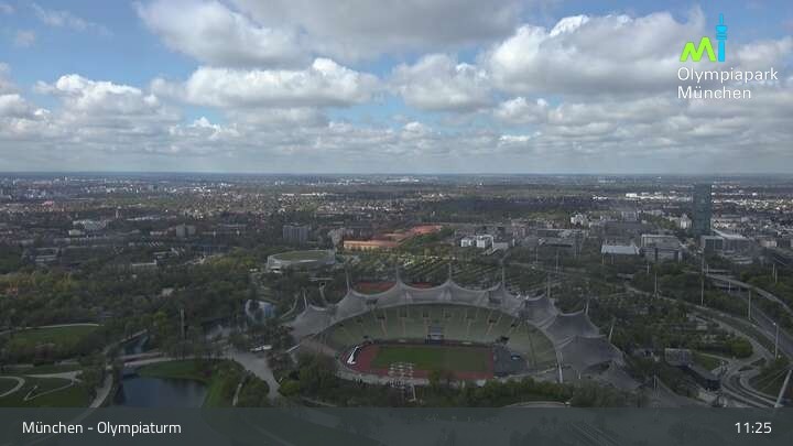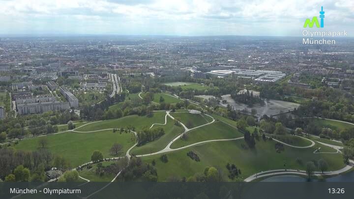View from Olympic Tower in Munich. It shows the Olympic Park Munich, with its soccer stadium and the Olympic Hall. The Olympic Park is located in the northwest of Munich's city center.