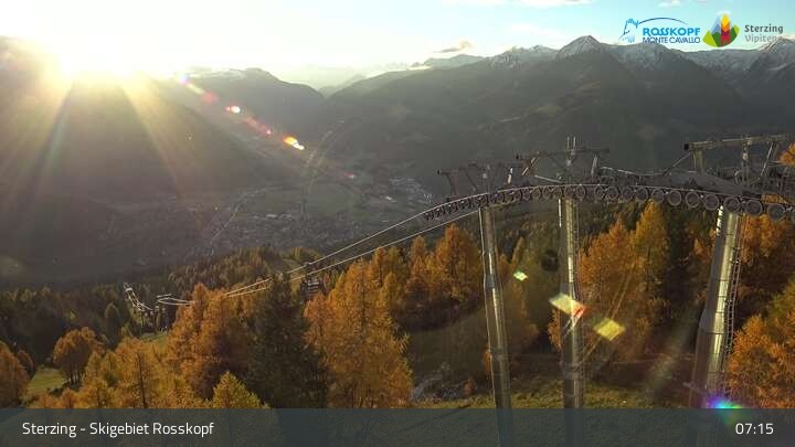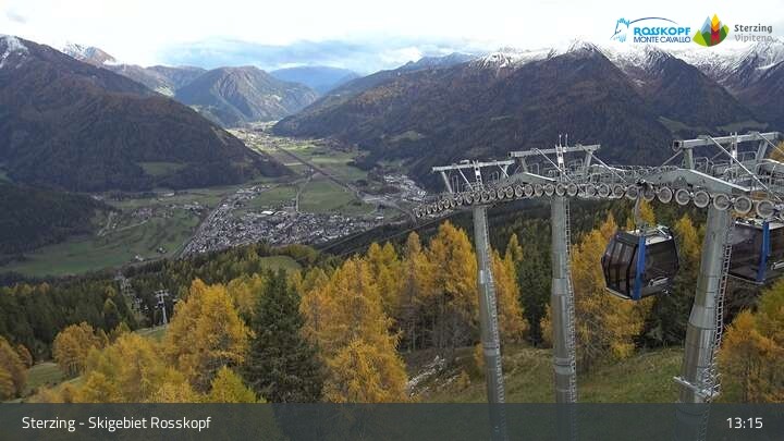 The camera is at the top station of the cable car at Rosskopf and shows the Stubai Alps.