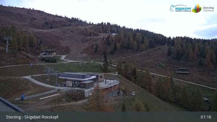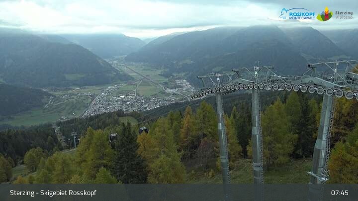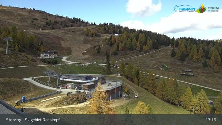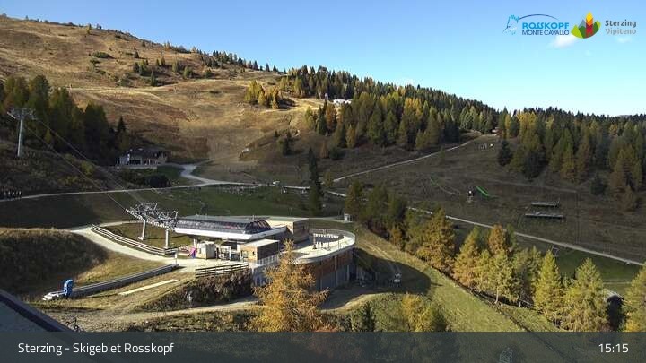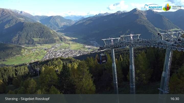 The camera is at the top station of the cable car at Rosskopf and shows the Stubai Alps.