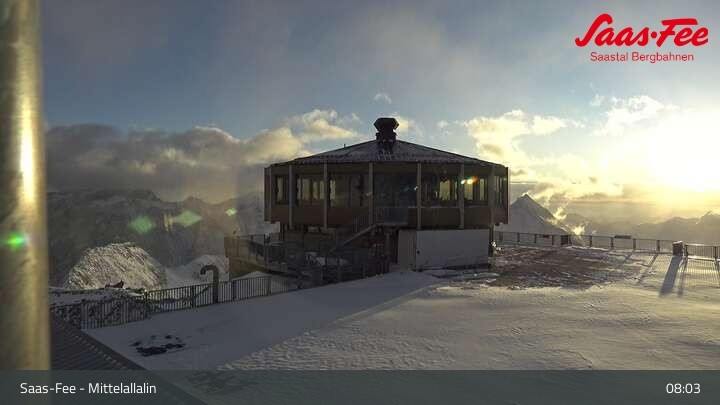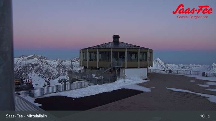 This webcam on Mittelallalin, a minor summit below Allalinhorn in Saas-Fee shows the local restaurant. From there you have a great view of the surrounding Alps of the Valais.