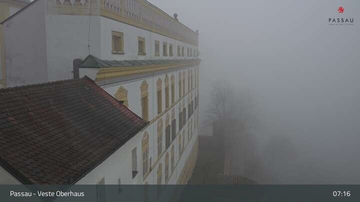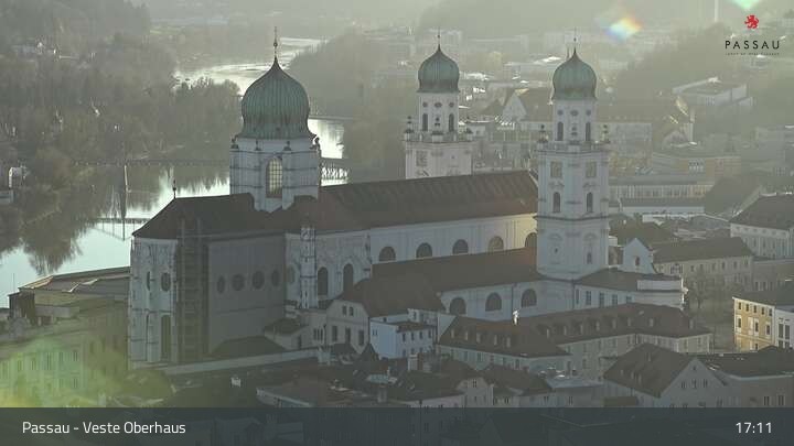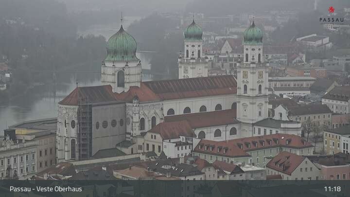 Live Webcam located at Veste Oberhaus in Passau. You can see the confluence of the three rivers Danube, Inn and Ilz and the beautiful old town of Passau with the white Cathedral St. Stephan.