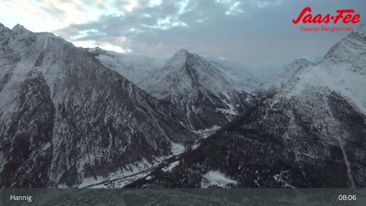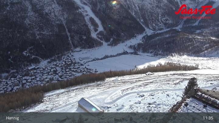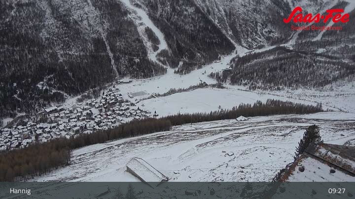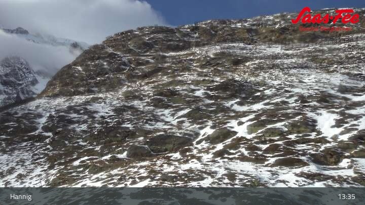The webcam opens a beautiful view from the top station of Hannig over Saas-Fee in the Swiss canton Valais.