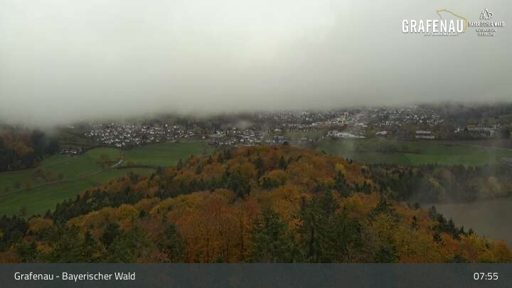 Enjoy the view of the climatic health resort Grafenau in the Bavarian Forest. The camera is located south of the town and looks north over the town to the Bavarian Forest National Park.