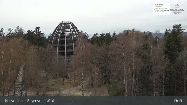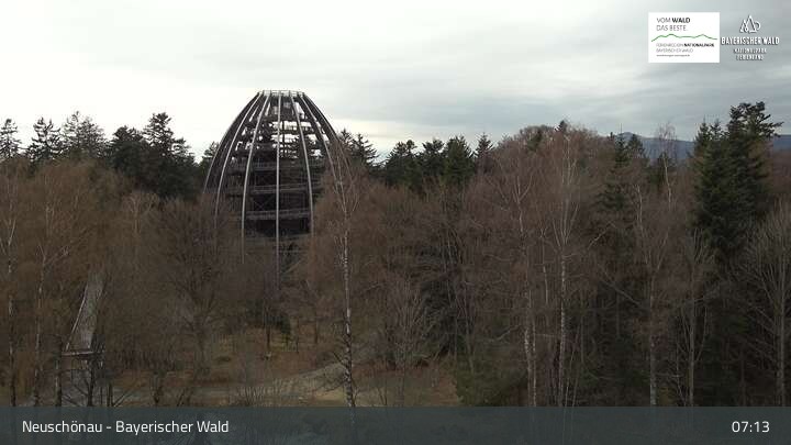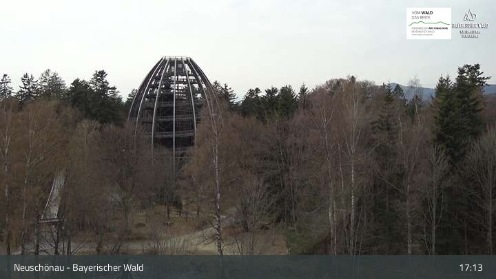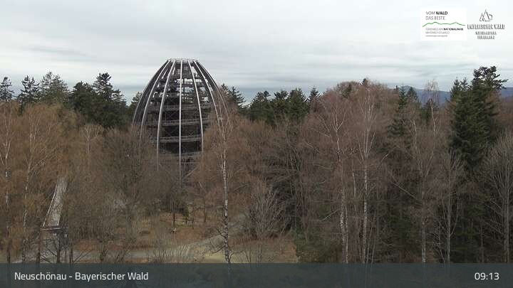 The camera is located in Neuschönau on the roof of the Hans-Eisemann-Haus visitor center in the Lusen National Park Center in the Bavarian Forest. You can also see the tree tower of the tree top walk, which is over 40 meters high.