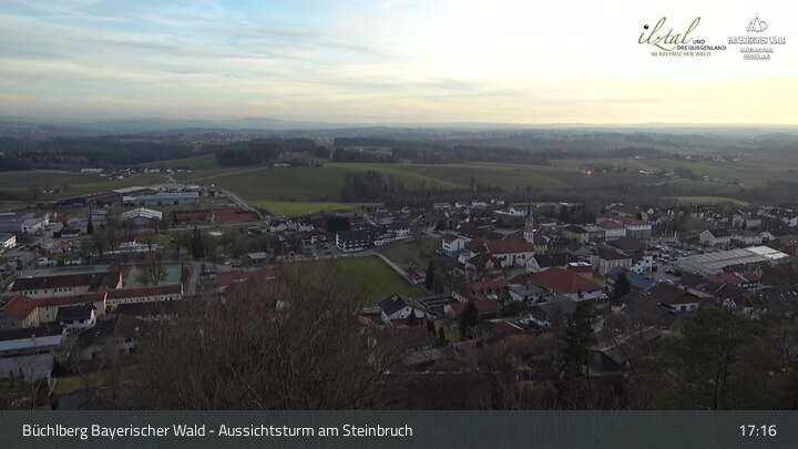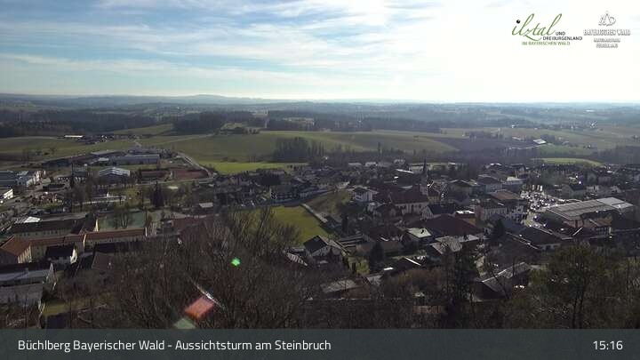 The camera looks from the lookout tower at the quarry over the village of Büchlberg and the quarry lake.