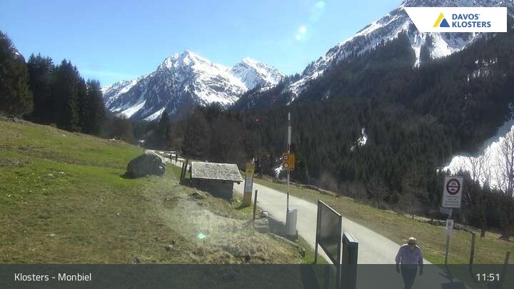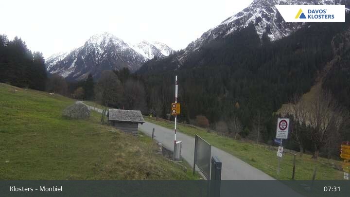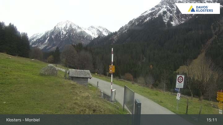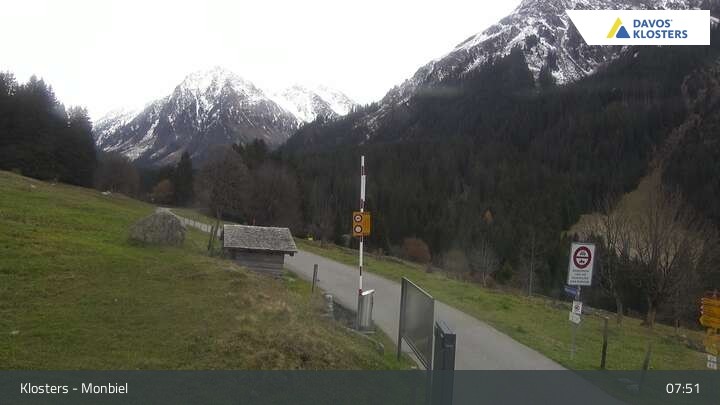 This webcam looks upon the surrounding mountain-scape of the Swiss alps from Monbiel car park near Klosters. A number of scenic hiking paths cross the village of Monbiel.