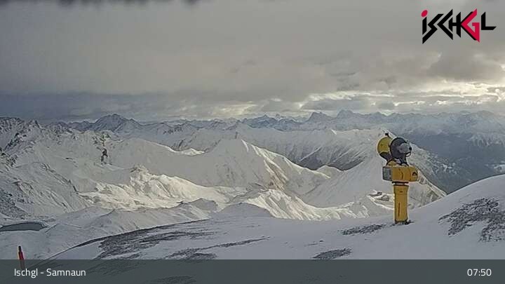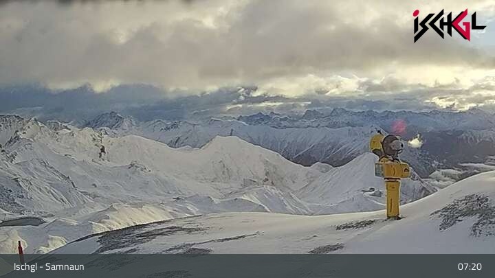 View from Greitspitze mountain over the surrounding Alpine landscape.