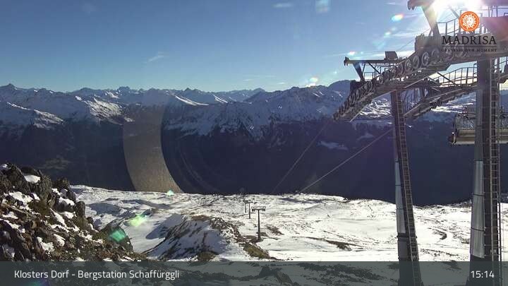 This webcam shows the top station of Schaffürggli lift on Madrisa. The mountain in the Swiss Alps features diverse hiking trails for you to explore.