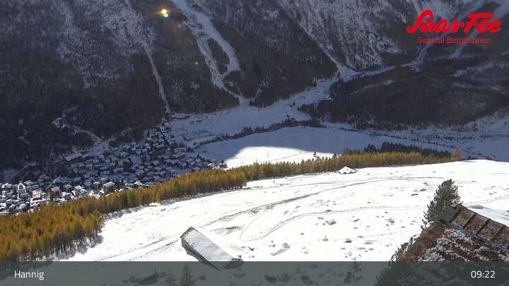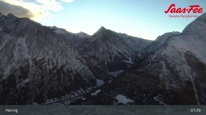 The webcam opens a beautiful view from the top station of Hannig over Saas-Fee in the Swiss canton Valais.