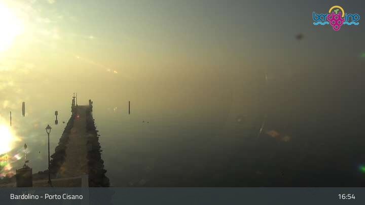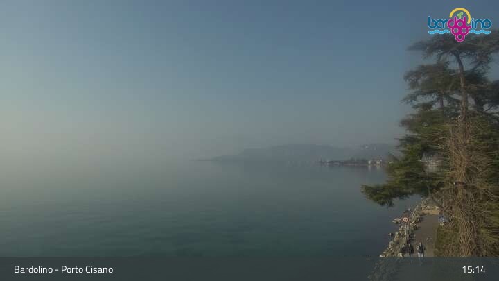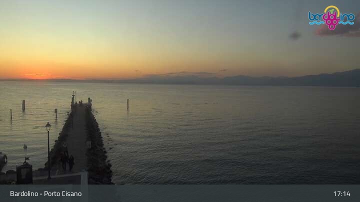 The camera is located on Lido Mirabello beach and looks north to the port of Bardolino on Lake Garda.