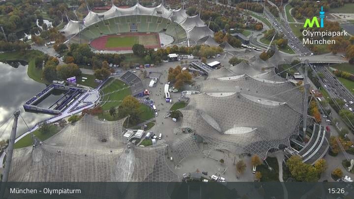 View from Olympic Tower in Munich. It shows the Olympic Park Munich, with its soccer stadium and the Olympic Hall. The Olympic Park is located in the northwest of Munich's city center.