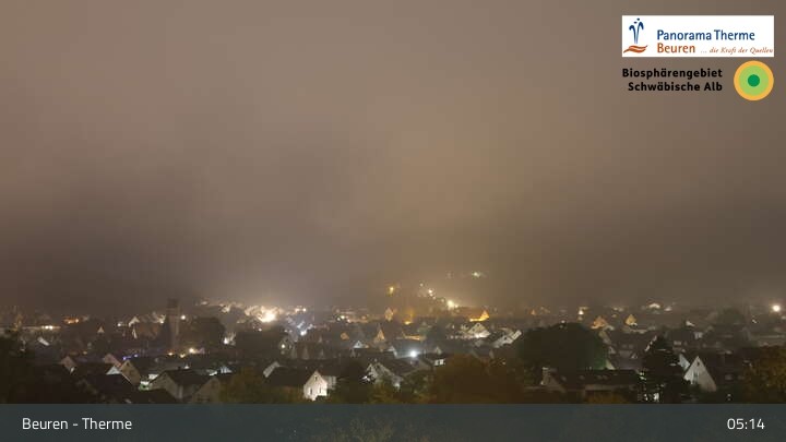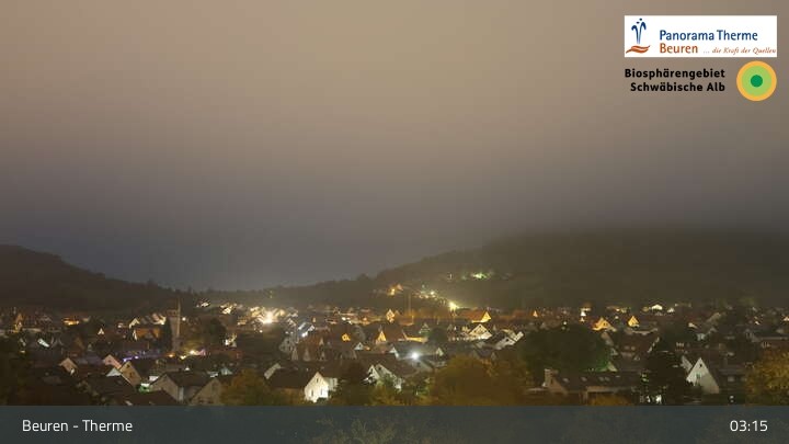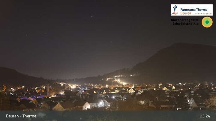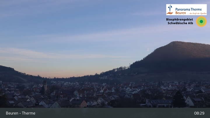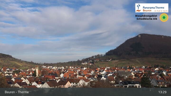 View over Beuren in the Swabian Mountains. The webcam is located at Panorama Therme Beuren, the thermal spa.