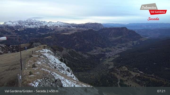 Located at Seceda thes webcam shows you the view towards South facing the mountains of Sella and Langkofel
