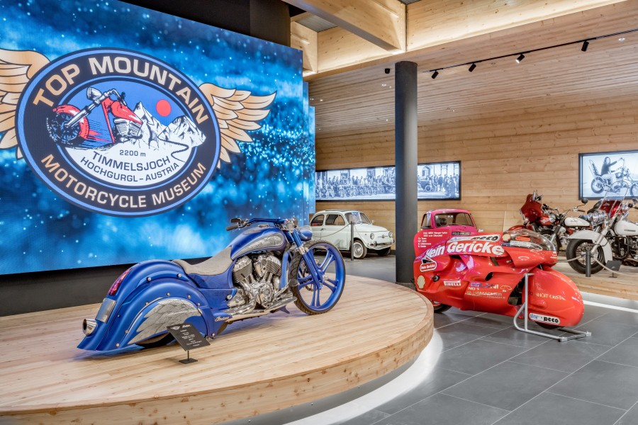 Europe's highest motorcycle museum, the TOP Mountain Motorcycle Museum, is located in Hochgurgl at the toll station of the Timmelsjoch High Alpine Road at an altitude of approx. 2,200 meters. Directly on the most attractive route over the Alps for motorcyclists, you will find more than 450 exhibits of motorcycle history in a building with breathtaking architectural language.