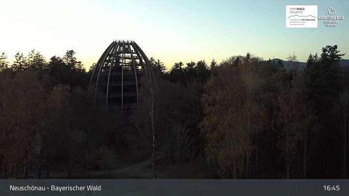 The camera is located in Neuschönau on the roof of the Hans-Eisemann-Haus visitor center in the Lusen National Park Center in the Bavarian Forest. You can also see the tree tower of the tree top walk, which is over 40 meters high.