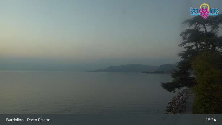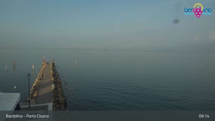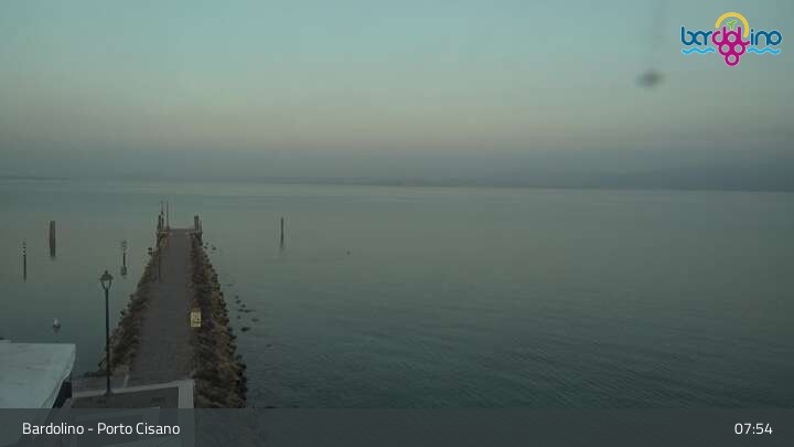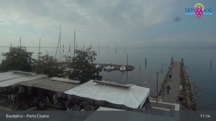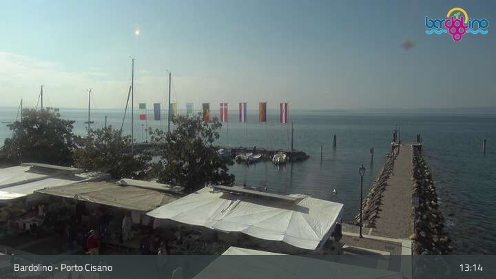 The camera is located on Lido Mirabello beach and looks north to the port of Bardolino on Lake Garda.