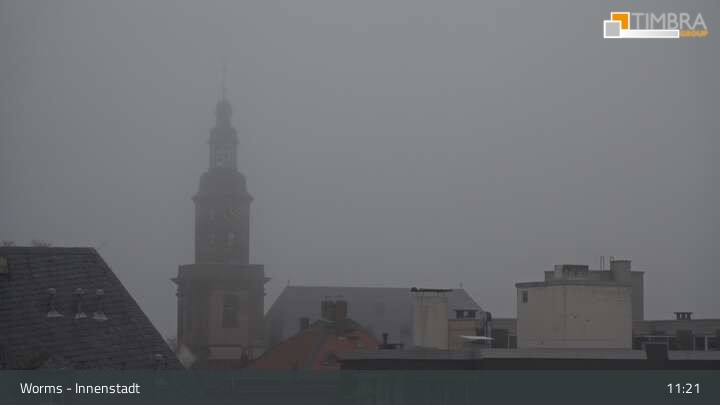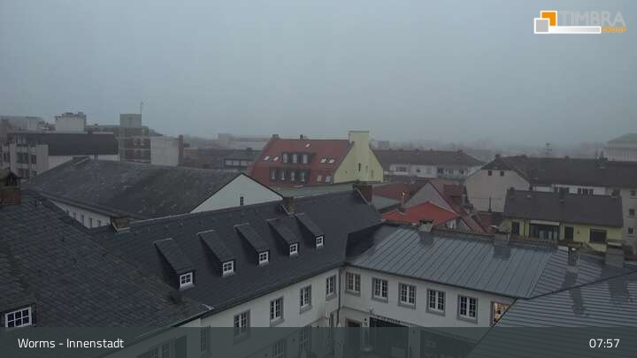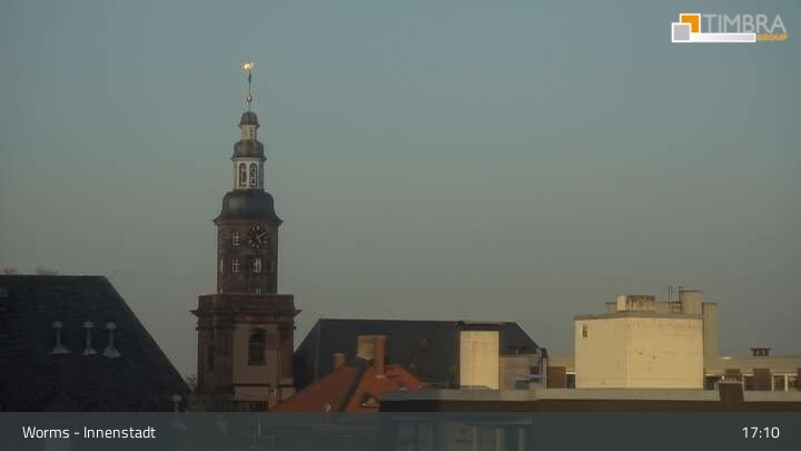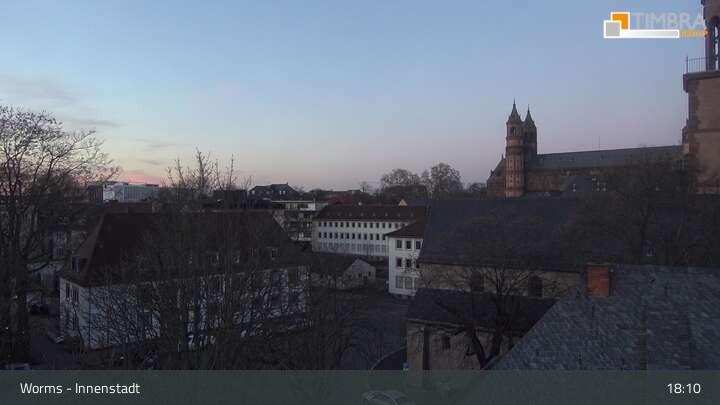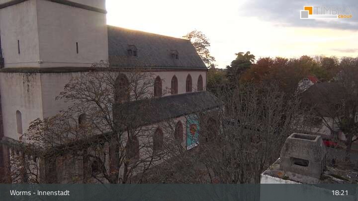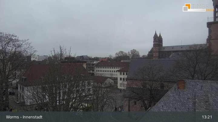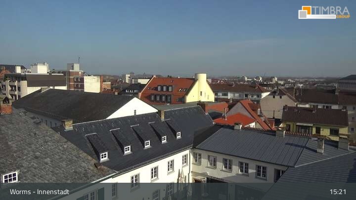 The webcam is located in the city center of Worms. The view wanders from the Magnus Church, behind which the towers of the Worms Cathedral St. Peter can be seen, over the roofs of the city to the Andreasstift and the city wall.