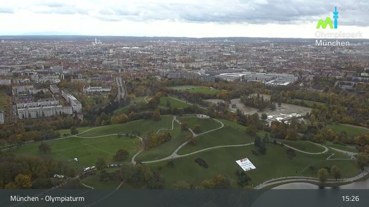 View from Olympic Tower in Munich. It shows the Olympic Park Munich, with its soccer stadium and the Olympic Hall. The Olympic Park is located in the northwest of Munich's city center.