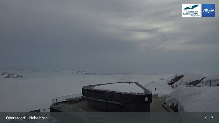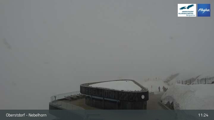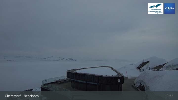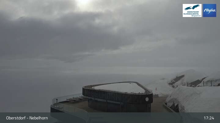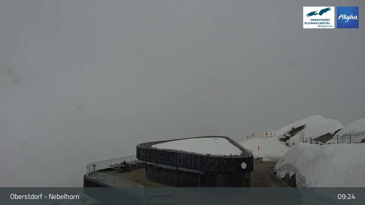 The live cam on Nebelhorn (Oberstdorf) shows the mountain panorama and the slopes below the peak.