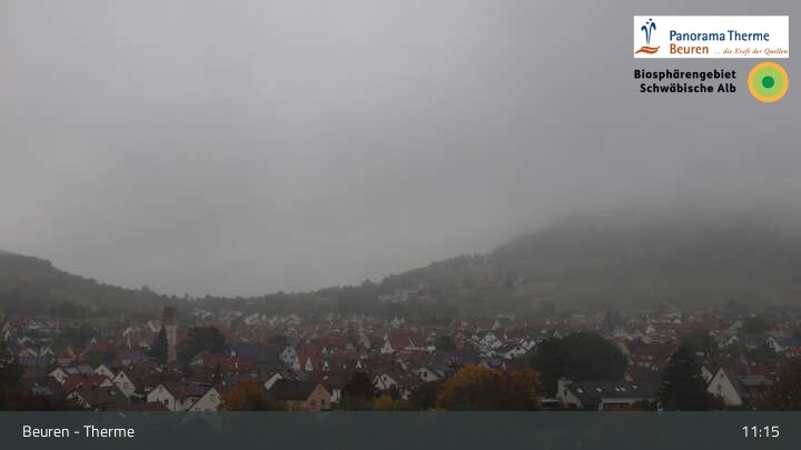 View over Beuren in the Swabian Mountains. The webcam is located at Panorama Therme Beuren, the thermal spa.
