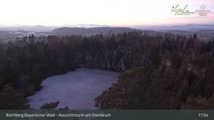 The camera looks from the lookout tower at the quarry over the village of Büchlberg and the quarry lake.