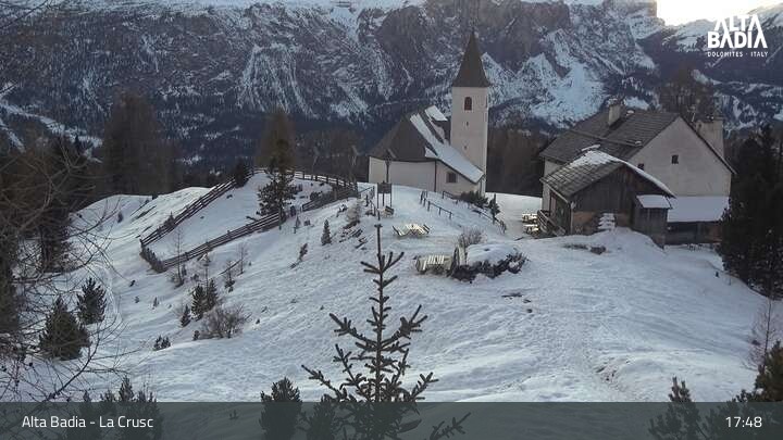 View from La Crusc chair's top station over the surrounding mountain-scape of Alta Badia. The little church is a popular place of pilgrimage.