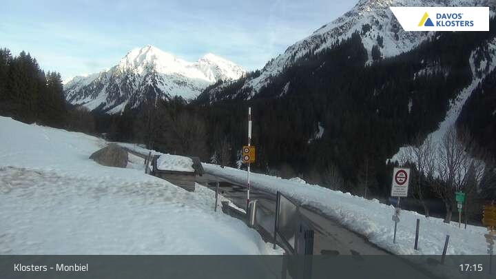 This webcam looks upon the surrounding mountain-scape of the Swiss alps from Monbiel car park near Klosters. A number of scenic hiking paths cross the village of Monbiel.