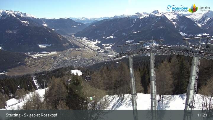 The camera is at the top station of the cable car at Rosskopf and shows the Stubai Alps.