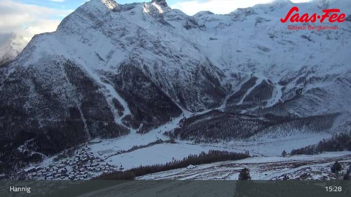 The webcam opens a beautiful view from the top station of Hannig over Saas-Fee in the Swiss canton Valais.