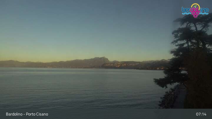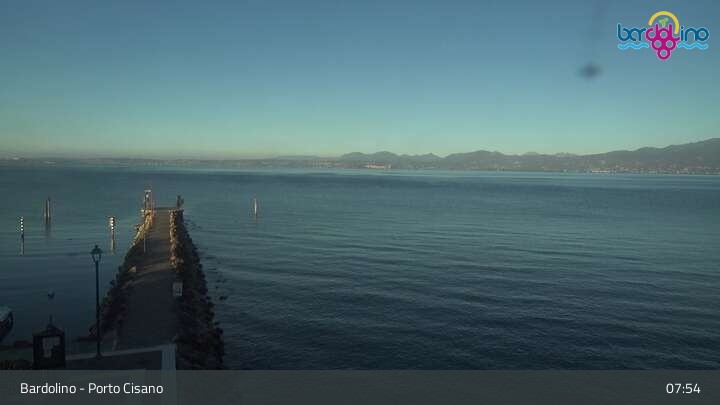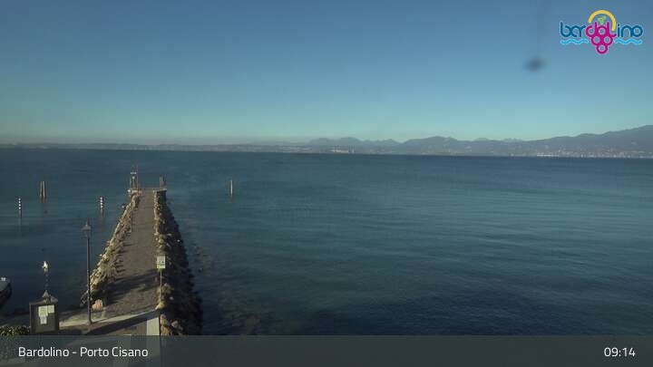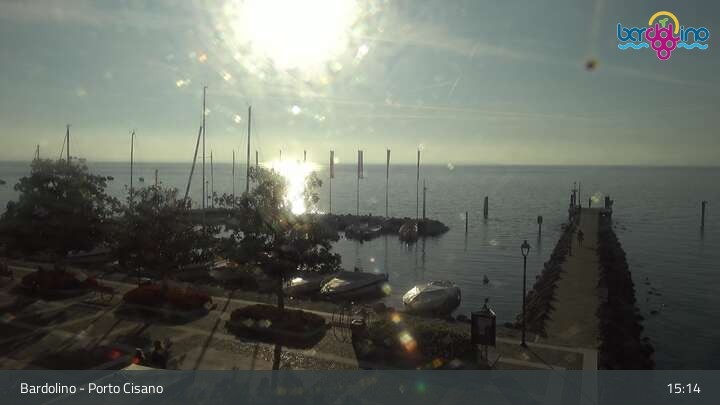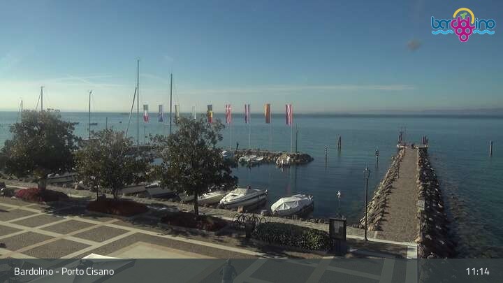 The camera is located on Lido Mirabello beach and looks north to the port of Bardolino on Lake Garda.