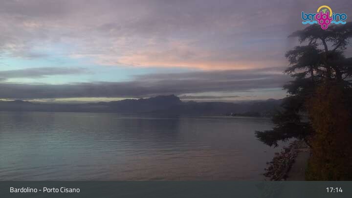 The camera is located on Lido Mirabello beach and looks north to the port of Bardolino on Lake Garda.