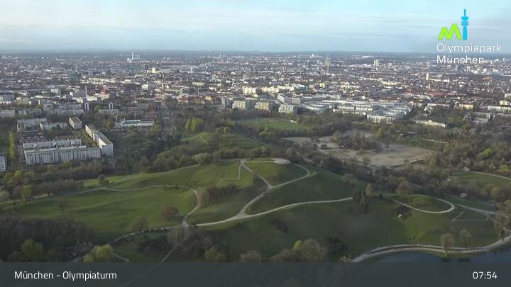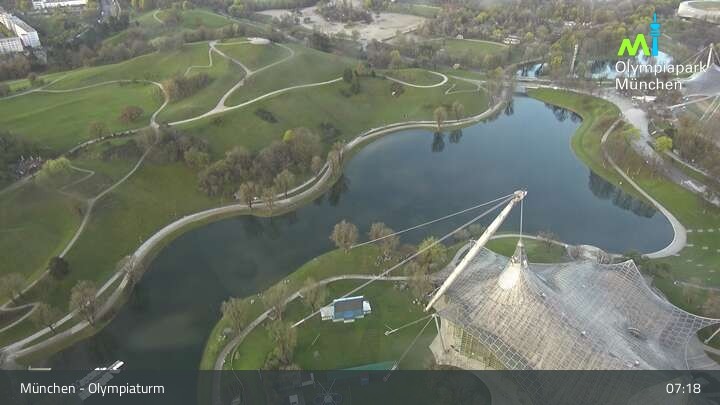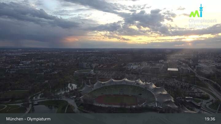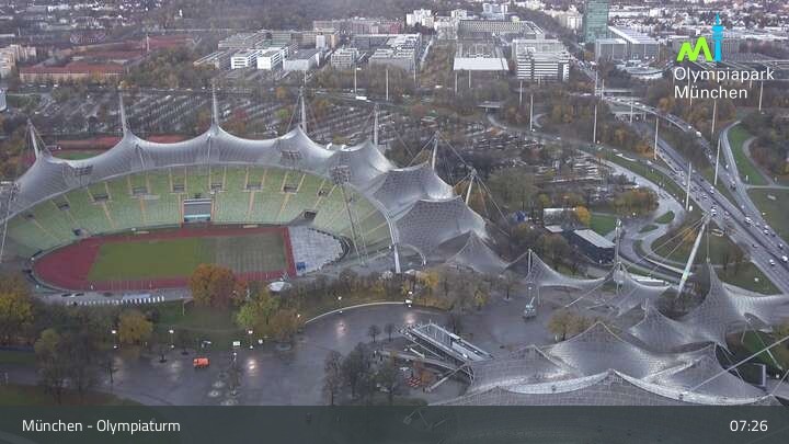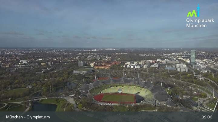 View from Olympic Tower in Munich. It shows the Olympic Park Munich, with its soccer stadium and the Olympic Hall. The Olympic Park is located in the northwest of Munich's city center.