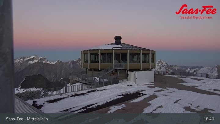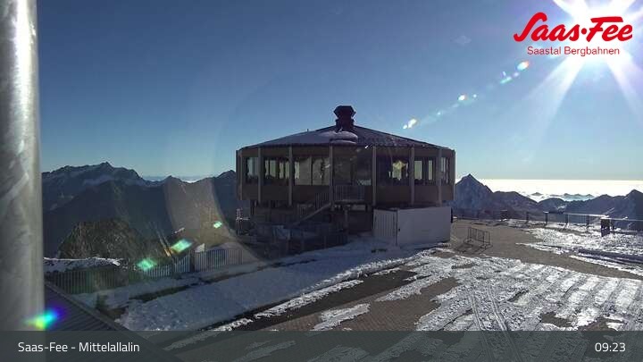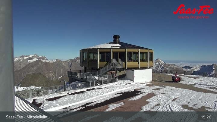 This webcam on Mittelallalin, a minor summit below Allalinhorn in Saas-Fee shows the local restaurant. From there you have a great view of the surrounding Alps of the Valais.