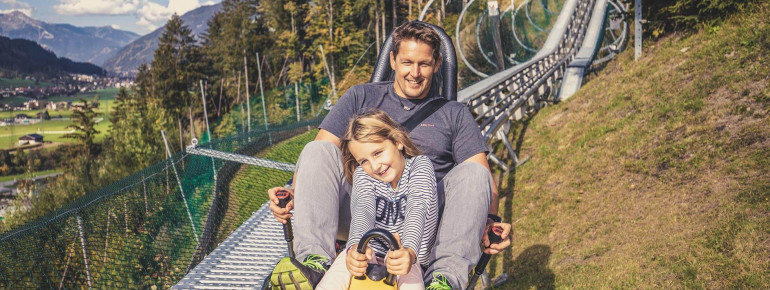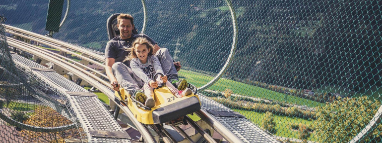 Ready for some tobogganing fun in the Zillertal Valley? At a length of 1,4km, the Arena Coaster, a mountain coaster, fascinates people of all ages with its waves, steep curves, jumps, and loops, which will be getting your adrenaline flowing. The descent lasts about 6 to 7 minutes with the highest point being 9m above the ground.