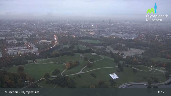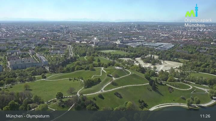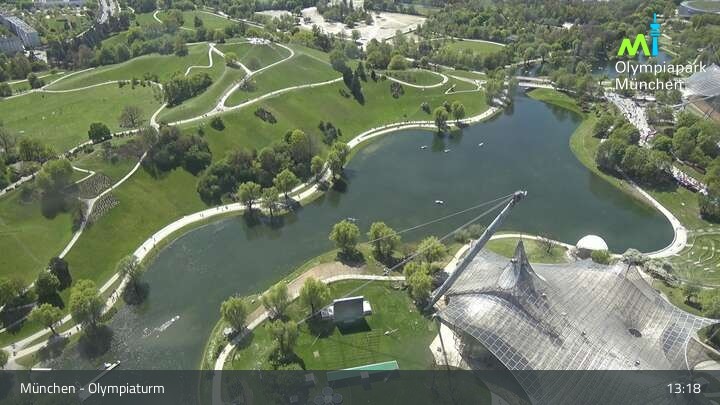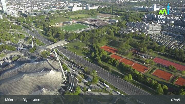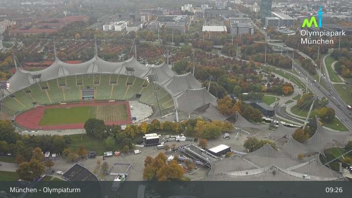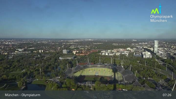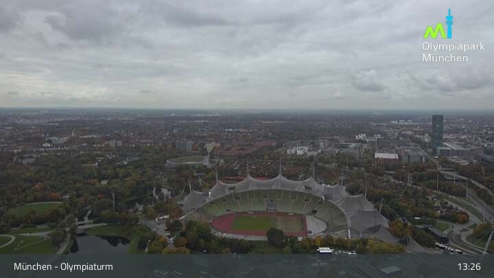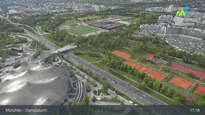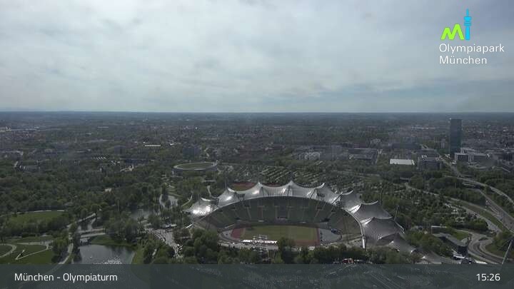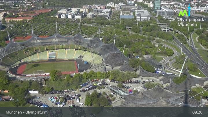 View from Olympic Tower in Munich. It shows the Olympic Park Munich, with its soccer stadium and the Olympic Hall. The Olympic Park is located in the northwest of Munich's city center.