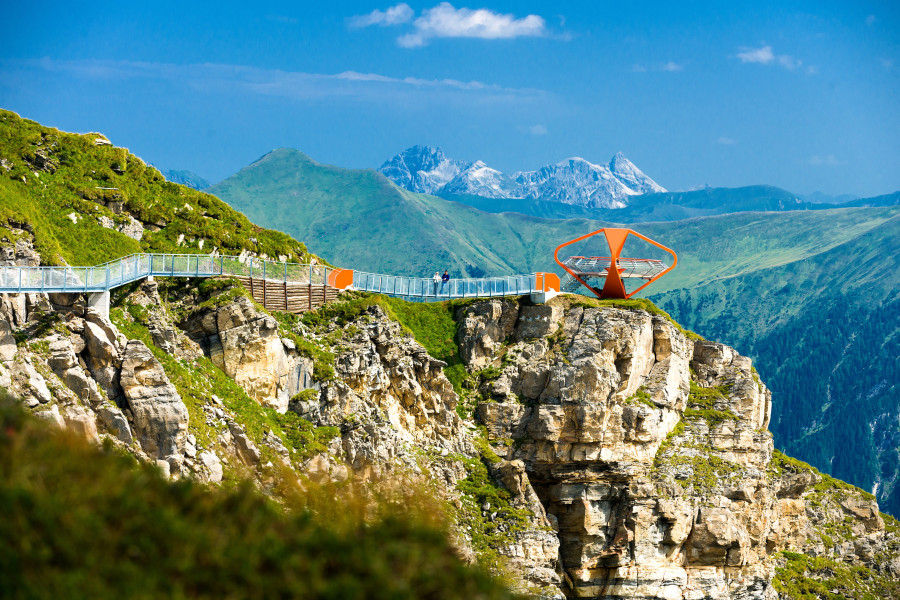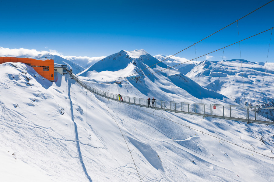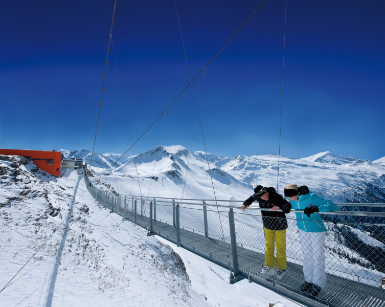 Stretching 140 meters, the bridge runs from the summit restaurant at the Stubnerkogel's top cable car station to a transmission facility. The cable structure sways gently underfoot, and the open design means you can see straight through it at every step, definitely not for the faint-hearted. Its unique construction makes it the first suspension bridge at such an altitude (2,300 m) that remains open throughout the entire year. Anyone looking to take home a memory of their experience on the bridge can make use of the photo point on the north side for the perfect snapshot.