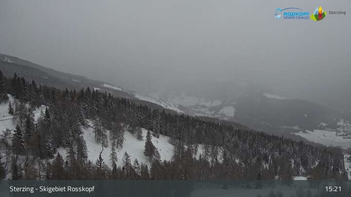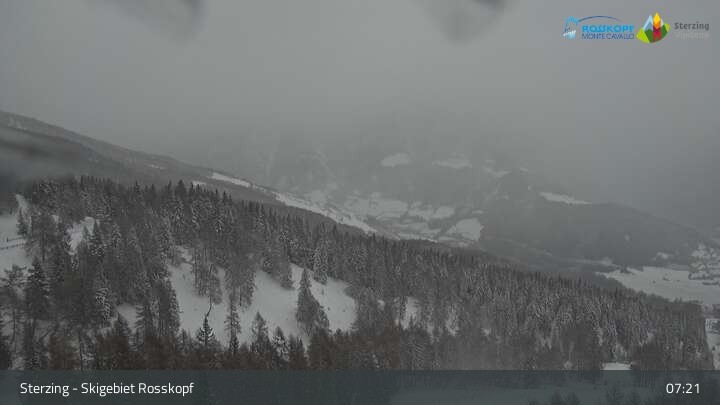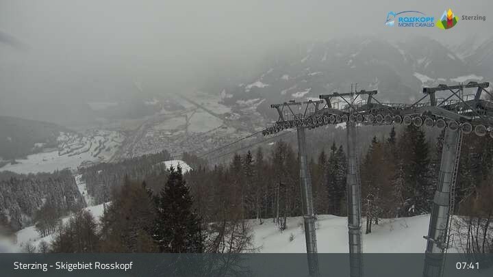 The camera is at the top station of the cable car at Rosskopf and shows the Stubai Alps.
