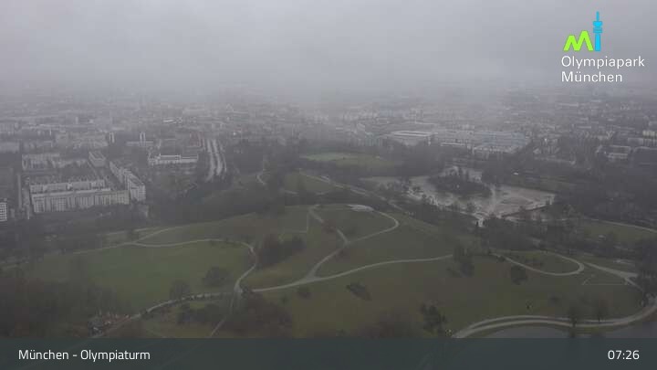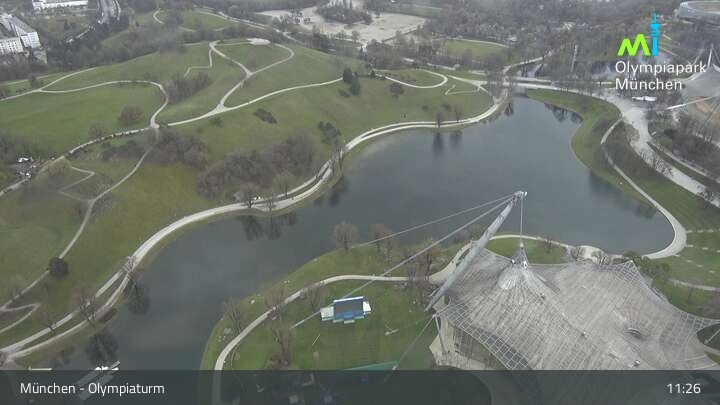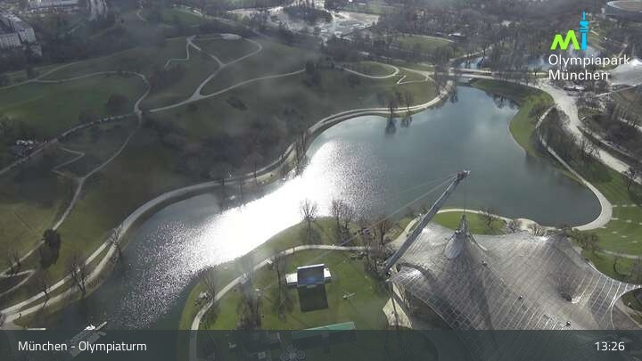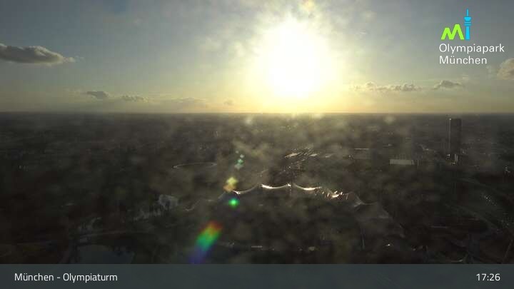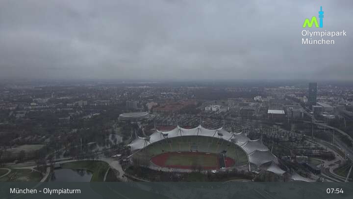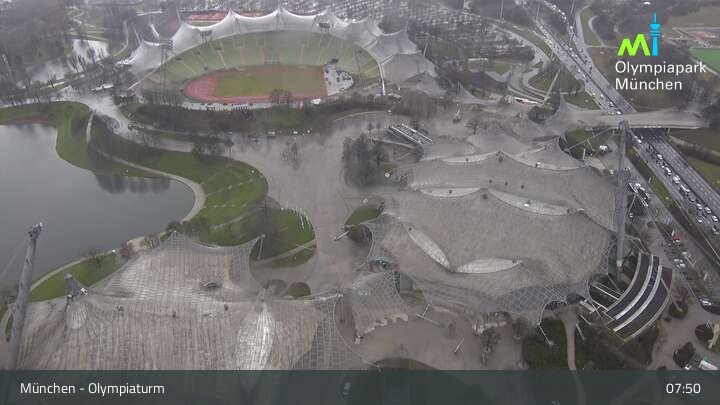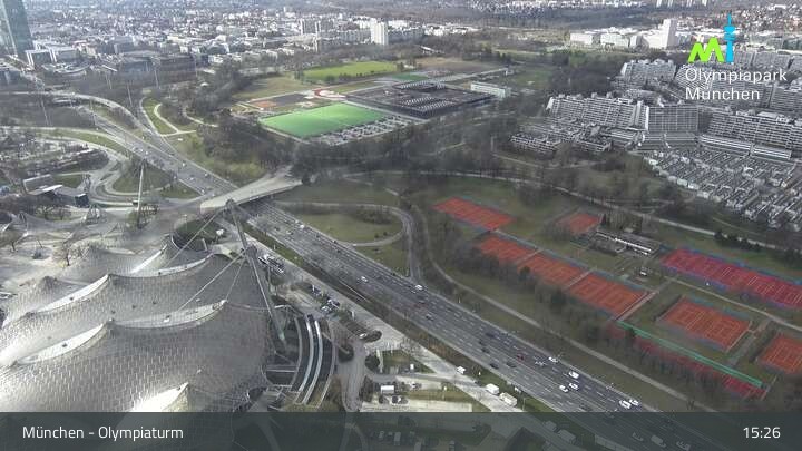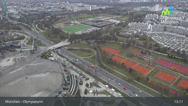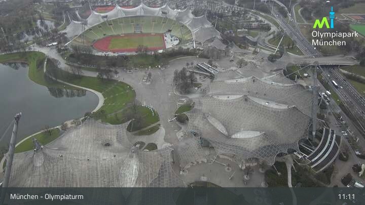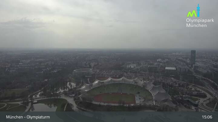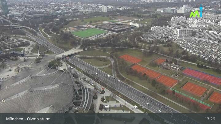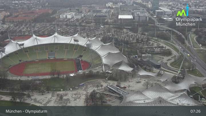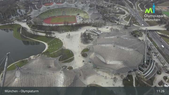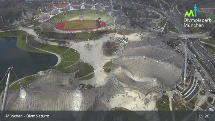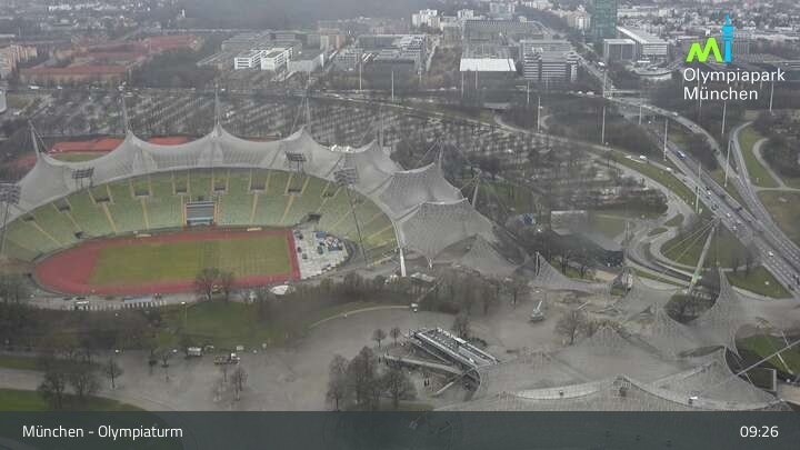View from Olympic Tower in Munich. It shows the Olympic Park Munich, with its soccer stadium and the Olympic Hall. The Olympic Park is located in the northwest of Munich's city center.
