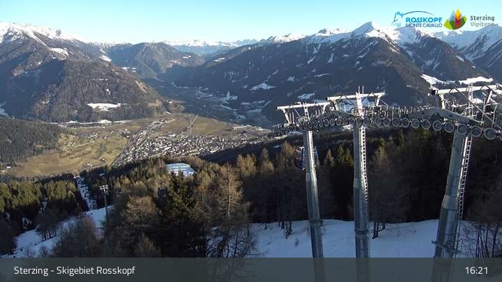 The camera is at the top station of the cable car at Rosskopf and shows the Stubai Alps.