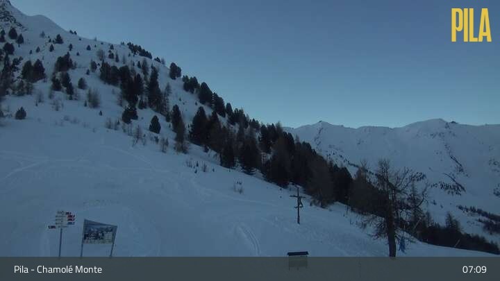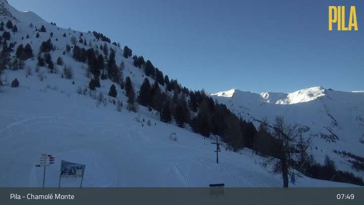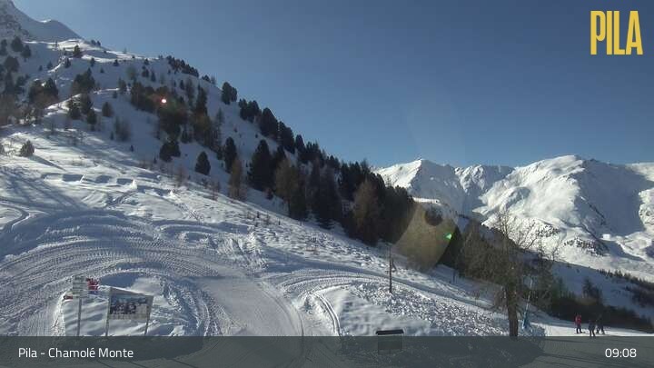 The webcam is located at the top station of Chamolé chair lift, and looks upon the mountains of Aosta valley.
