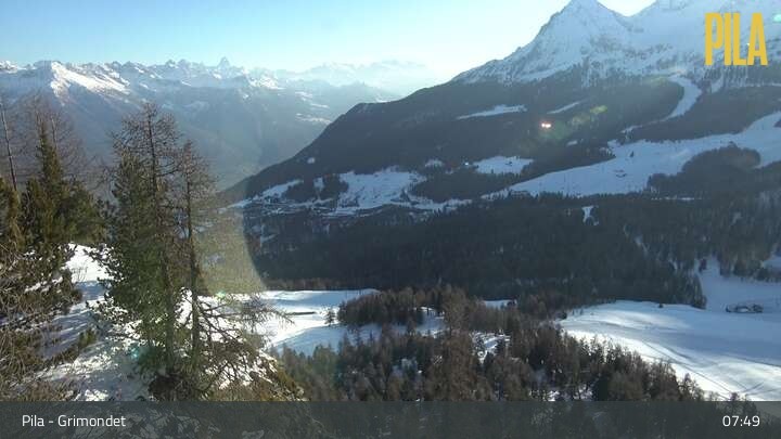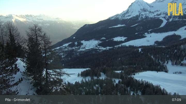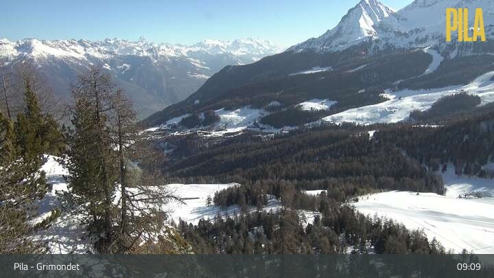 This webcam, located at chair lift Grimondet's top station, looks over the surrounding mountain-scape of Pila in the Aosta valley.