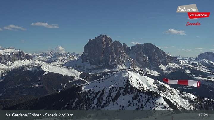 Located at Seceda thes webcam shows you the view towards South facing the mountains of Sella and Langkofel
