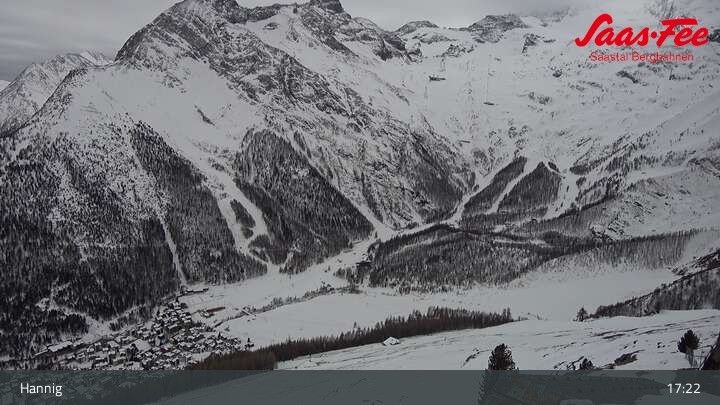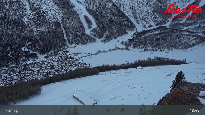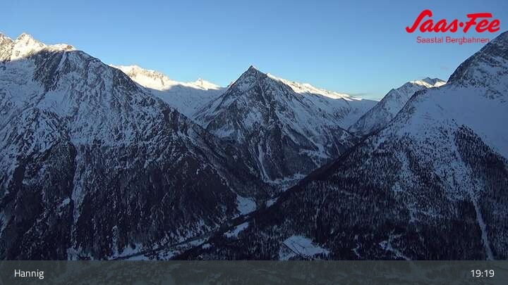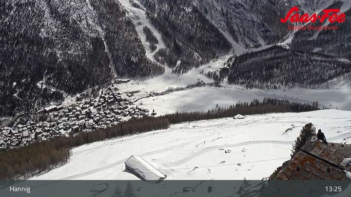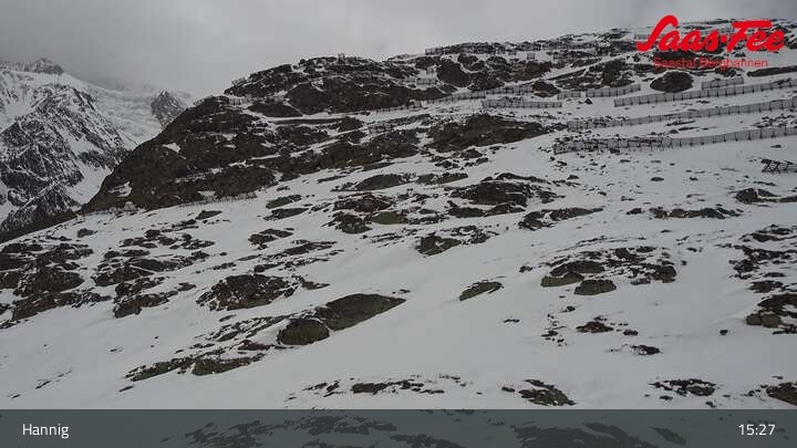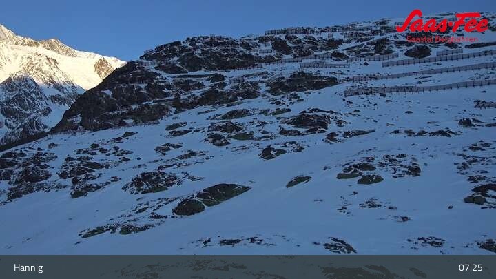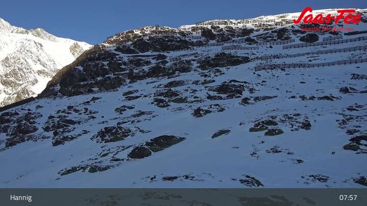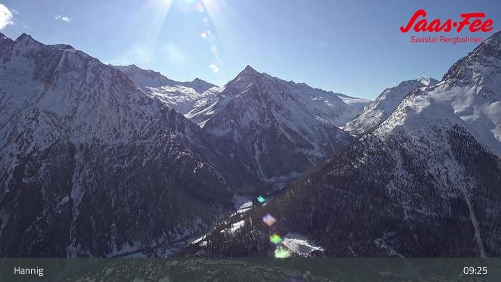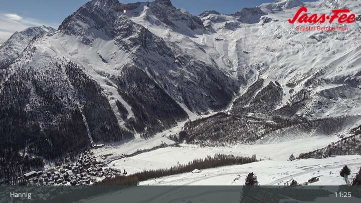 The webcam opens a beautiful view from the top station of Hannig over Saas-Fee in the Swiss canton Valais.