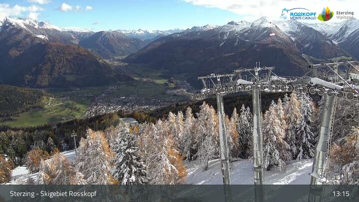The camera is at the top station of the cable car at Rosskopf and shows the Stubai Alps.