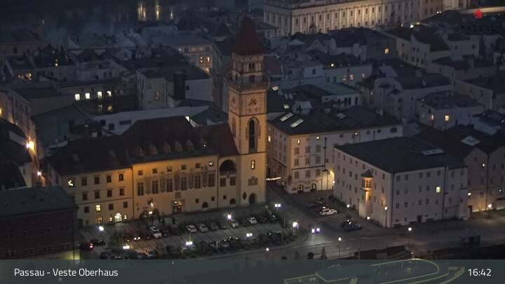 Live Webcam located at Veste Oberhaus in Passau. You can see the confluence of the three rivers Danube, Inn and Ilz and the beautiful old town of Passau with the white Cathedral St. Stephan.