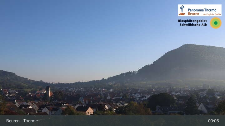 View over Beuren in the Swabian Mountains. The webcam is located at Panorama Therme Beuren, the thermal spa.