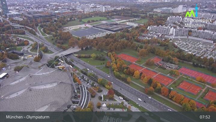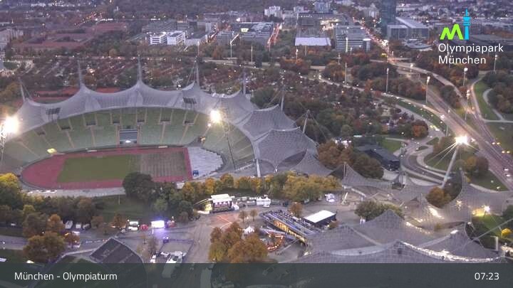 View from Olympic Tower in Munich. It shows the Olympic Park Munich, with its soccer stadium and the Olympic Hall. The Olympic Park is located in the northwest of Munich's city center.