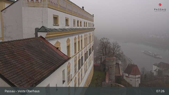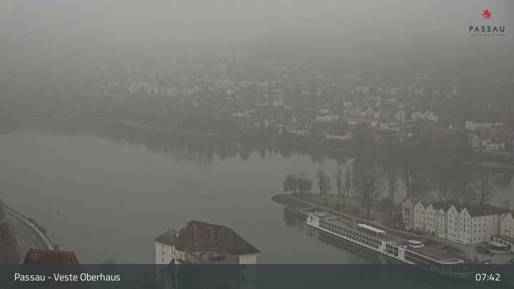 Live Webcam located at Veste Oberhaus in Passau. You can see the confluence of the three rivers Danube, Inn and Ilz and the beautiful old town of Passau with the white Cathedral St. Stephan.