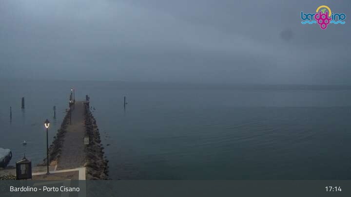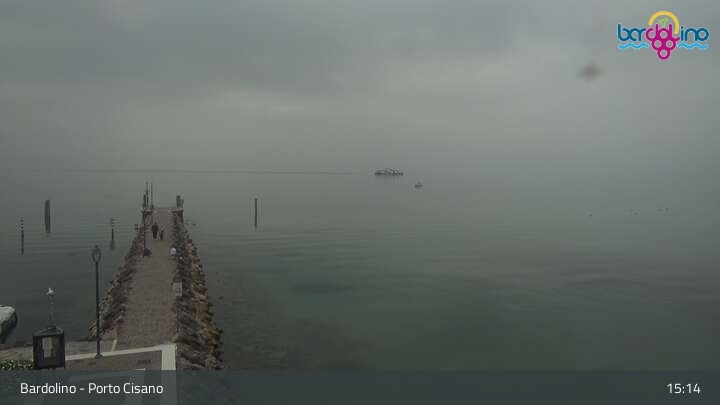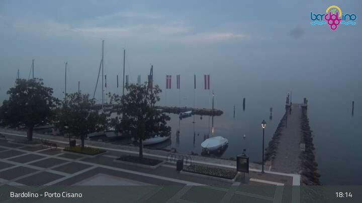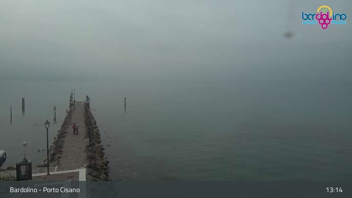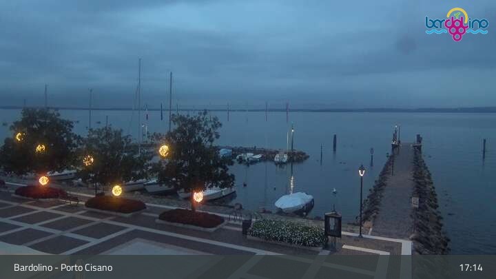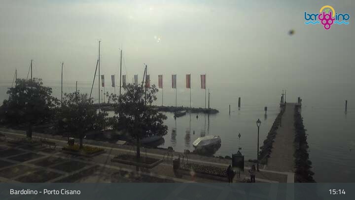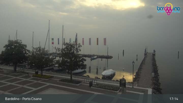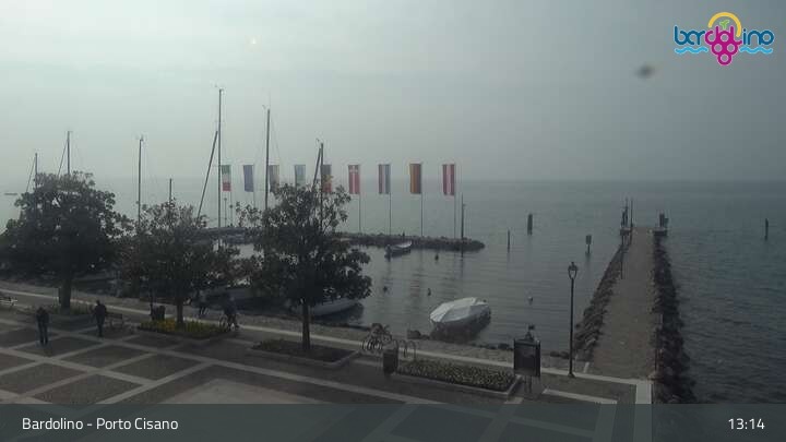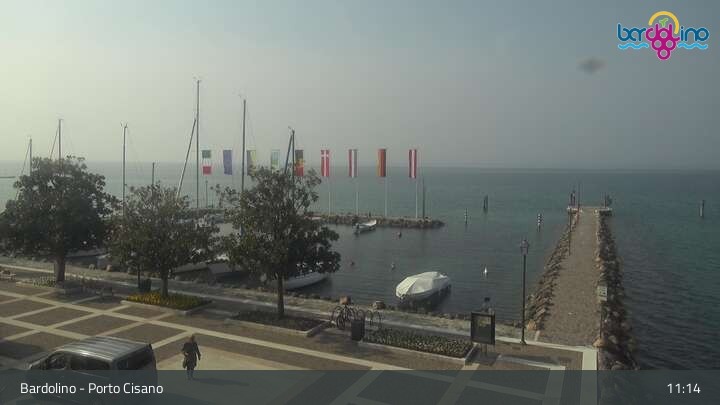 The camera is located on Lido Mirabello beach and looks north to the port of Bardolino on Lake Garda.